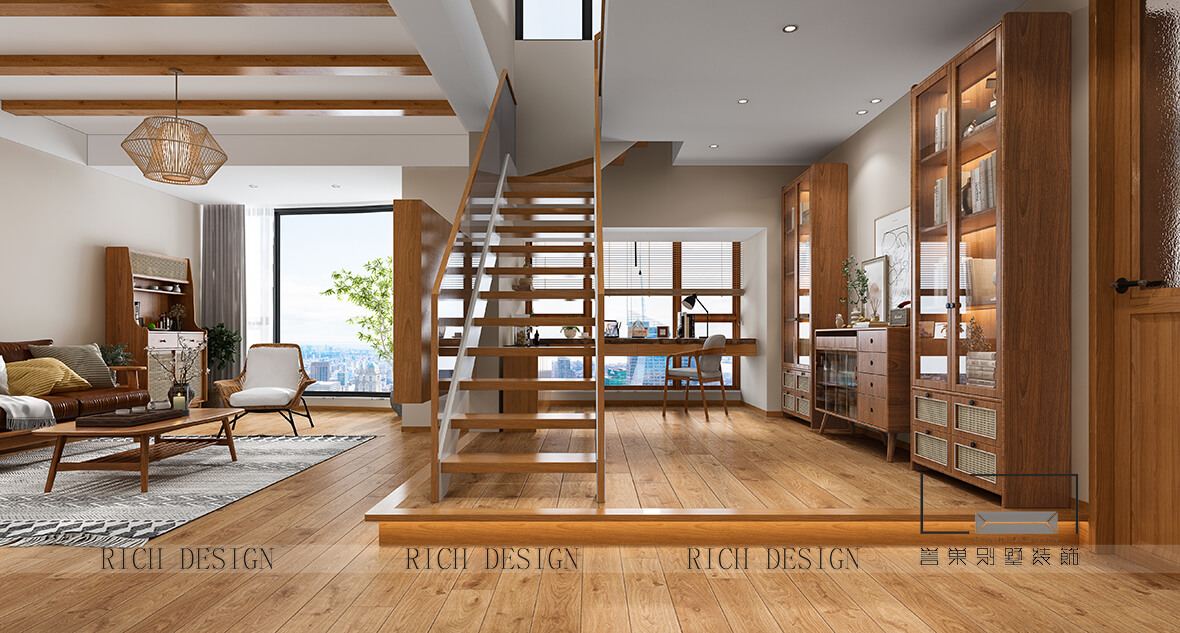 這是一套230m2頂樓復式,采用大塊面的原木色飾面板包裹住的房子,將客餐廳、臥室與書房,進行合理分區,組成一個個方形空間,仿佛置身于一個大木盒中。 客戶與設計師一致認為,簡單、隨興與自在,便是生活最美的樣子,而日式原木恰巧能滿足客戶內心對生活的期望。